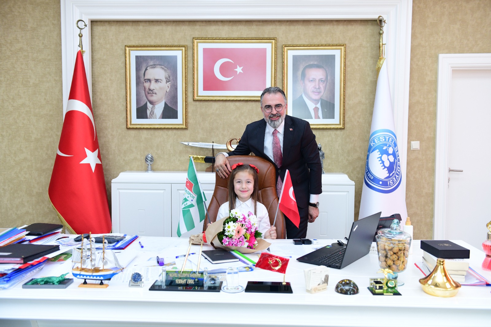 Programların ardından Başkan Ferhat Erol’u makamında ziyaret eden çocuklar, bayram coşkusunu bu kez belediye binasında yaşadı. Başkan Erol, minik misafirleriyle yakından ilgilenerek onların mutluluğuna ortak oldu.