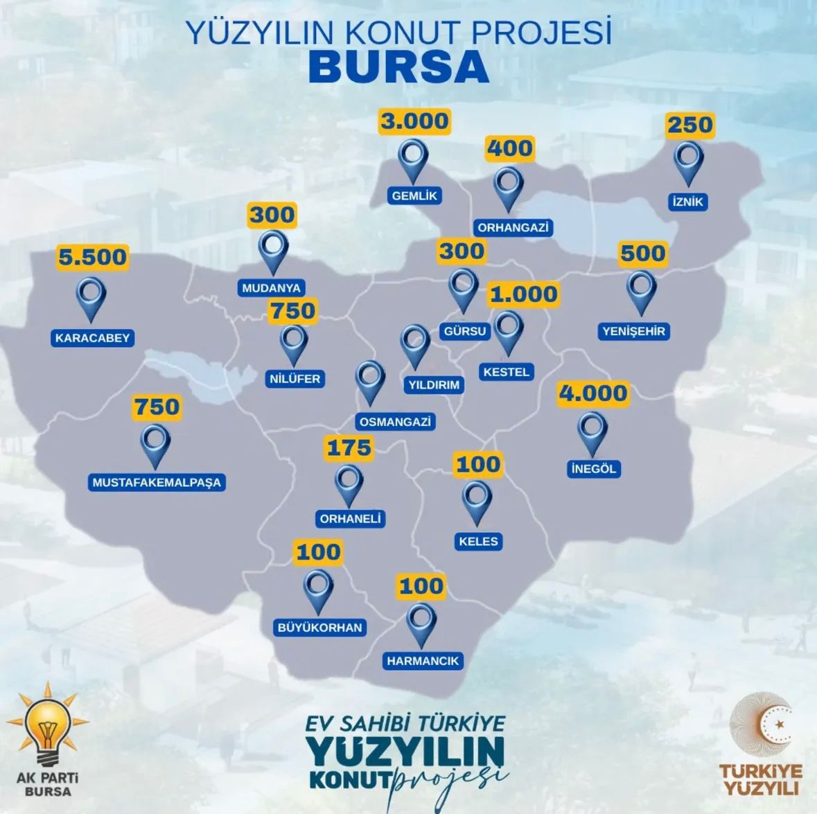 Karacabey 5.500, Gemlik 3.000, İnegöl 4.000, Kestel 1.000 Nilüfer 750, Mustafakemalpaşa 750, Yenişehir 500, Orhangazi 400, Gürsu 300, Mudanya 300, İznik 250, Orhaneli 175, Keles 100, Büyükorhan 100, Harmancık 100 konut olacak şekilde toplamda 17 bin 225 konut hayata geçirilecek.